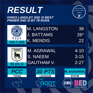 In reply, early wickets settled the nerves and in the end Pinner would be dismissed for 86 in 21.3 overs. Recent joiner Meet Agrawal was the star of the show with an impressive 8 over spell of 4 wickets for 10 runs. Sajid Naeem also picked up 3-15 off 5 and Gautham Venkatasubramanyan claimed 2-27. Victory by 78 runs and 30 crucial league points.