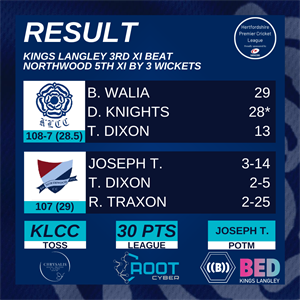 A regular loss of wickets saw Kings Langley reduced to 67-6, bringing Danny Knights and Terry Dixon together at the crease. They steadied the ship and battled hard as they combined to add 32 invaluable runs before Terry was dismissed for 13 from 36 balls. Joseph T came to the crease but he wasn’t to be needed as Danny decided to finish the job. He finished unbeaten with an outstanding 28 runs – the number of runs not doing justice to the value of them in terms of securing victory. The target was reached in the 29th over with 3 wickets in hand.